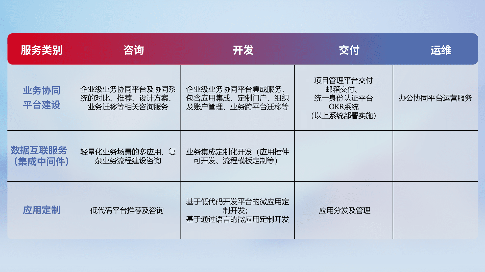 针对钉钉、、、、企微、、、IDaas等平台级产品提供产品的规划、、、方案、、、、交付、、、、定制化开发等服务,,,,实现如统一协同办公、、、、智能客户服务、、、混合会议管理、、智能数据查询、、等业务场景,,,,实现数字化转型。。。。