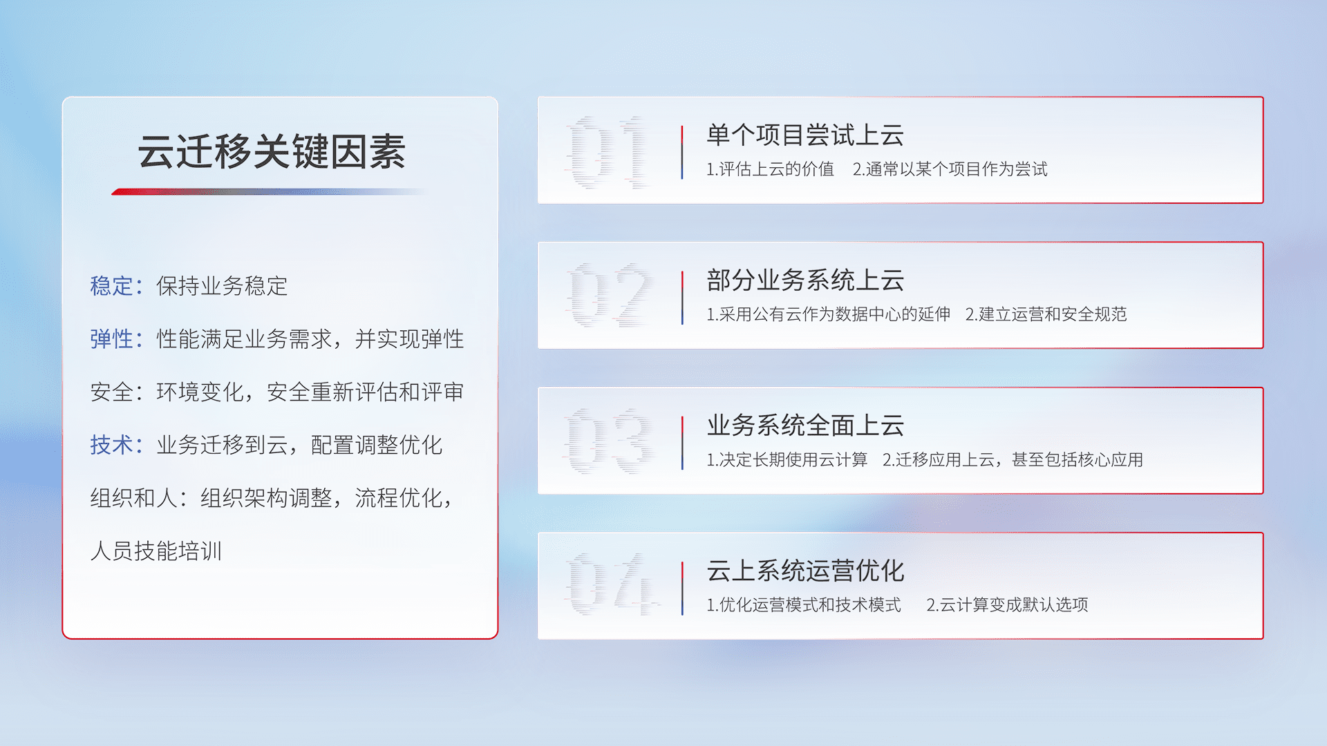 结合实际业务,,,,从规划设计、、、云平台选型、、、云原生改造、、数据迁移、、、集成交付,,,迁移全过程为客户识别最佳上云路径,,做好风险识别管理,,设计网络架构、、、、身份权限、、、、安全审计合规、、、操作审计、、日志审计、、监控告警策略、、多站点容灾设计等,,对云上基础设施进行整体规划,,,提升IT治理水平,,,以满足弹性、、高可用、、、高性能的需求。。。