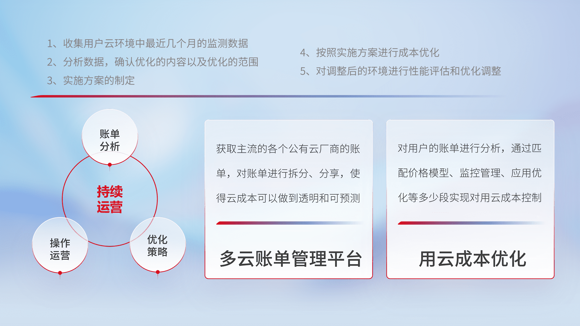 通过多云纳管,,,以统一的资源数据模型把客户的云资源进行抽象和封装,,,进而实现对多云资源的统一操作,,,,保障云资源管理的可靠性、、、、稳定性与可用性。。量身定制化运维内容,,,,配置、、、、开发运维、、补丁管理、、、备份、、监控、、认证和访问管理、、审计和日常巡检等,,,保障在用云过程中的可靠度,,稳定度以及高可用率。。