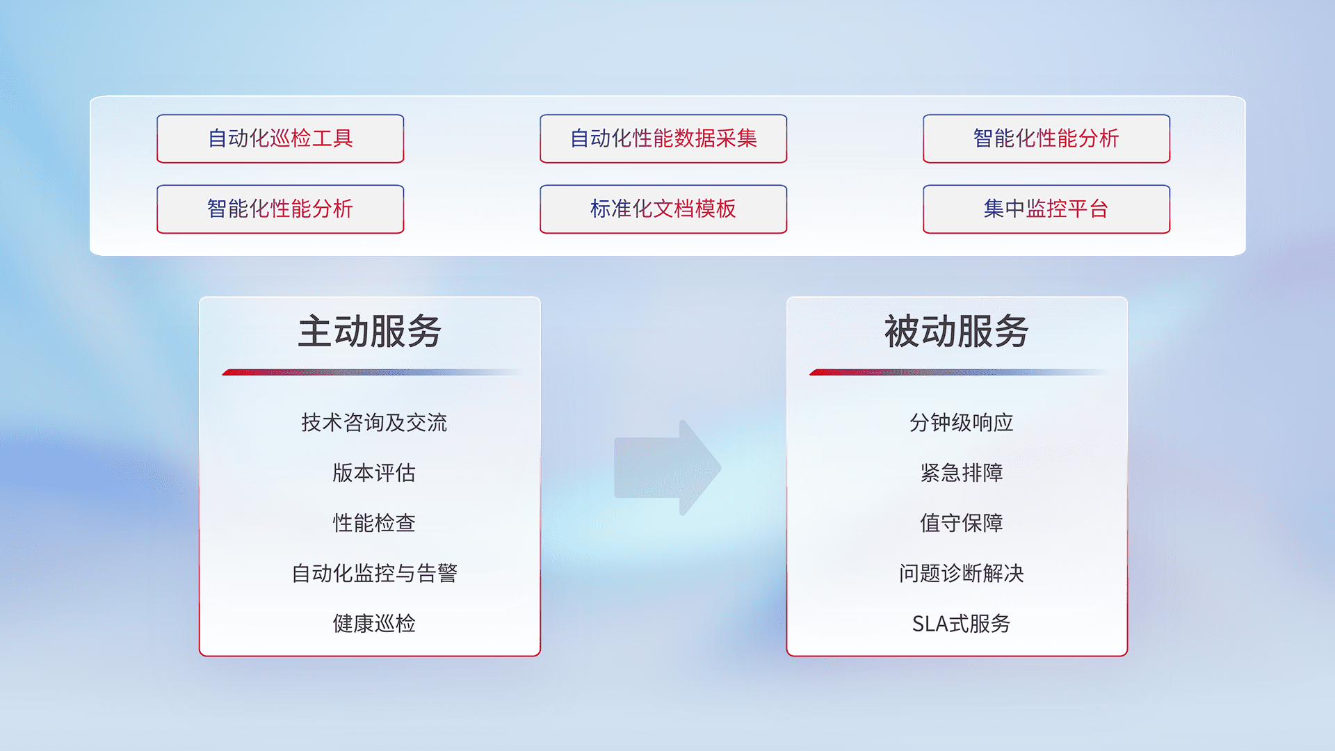 智能化工具和标准化文档,,保障服务质量,,提供主动服务(包含技术咨询、、、版本评估、、、、性能检查、、自动化监控与告警、、、健康巡检)和被动服务包含(分钟级响应、、、紧急排障、、、值守保障、、问题诊断解决、、、SLA服务)。。。